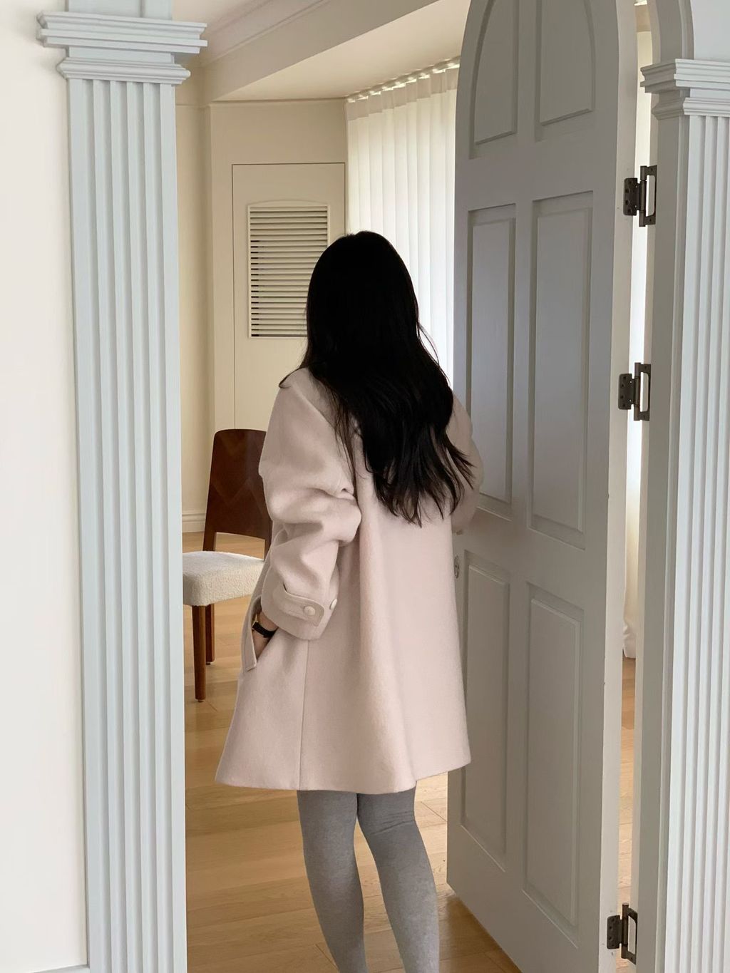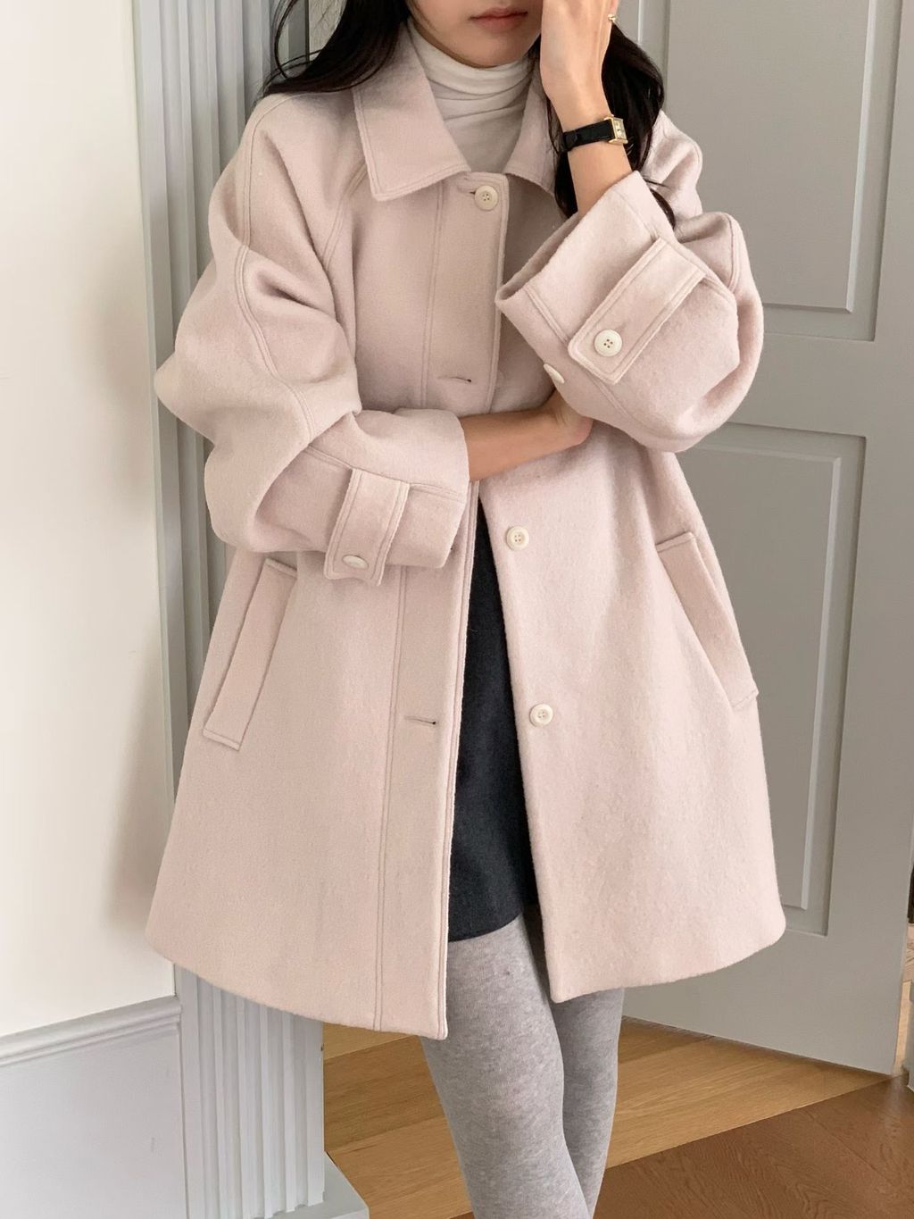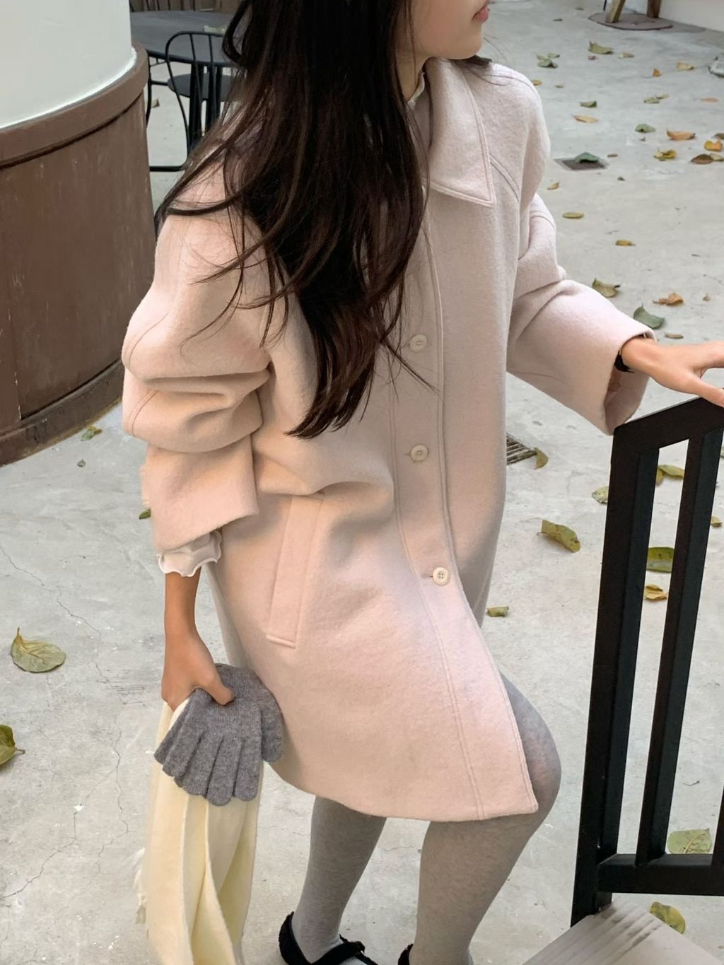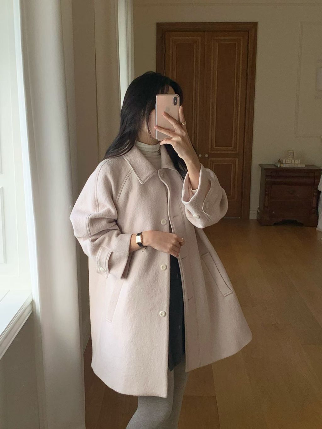 溫柔氣質翻領排釦羊毛長版外套 (Wool 80%)