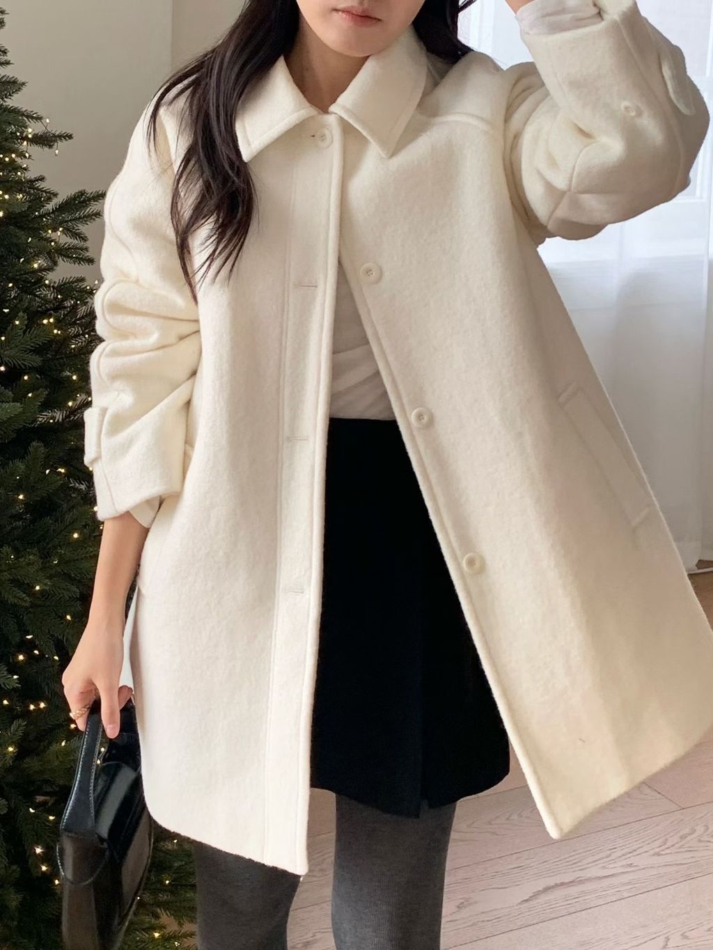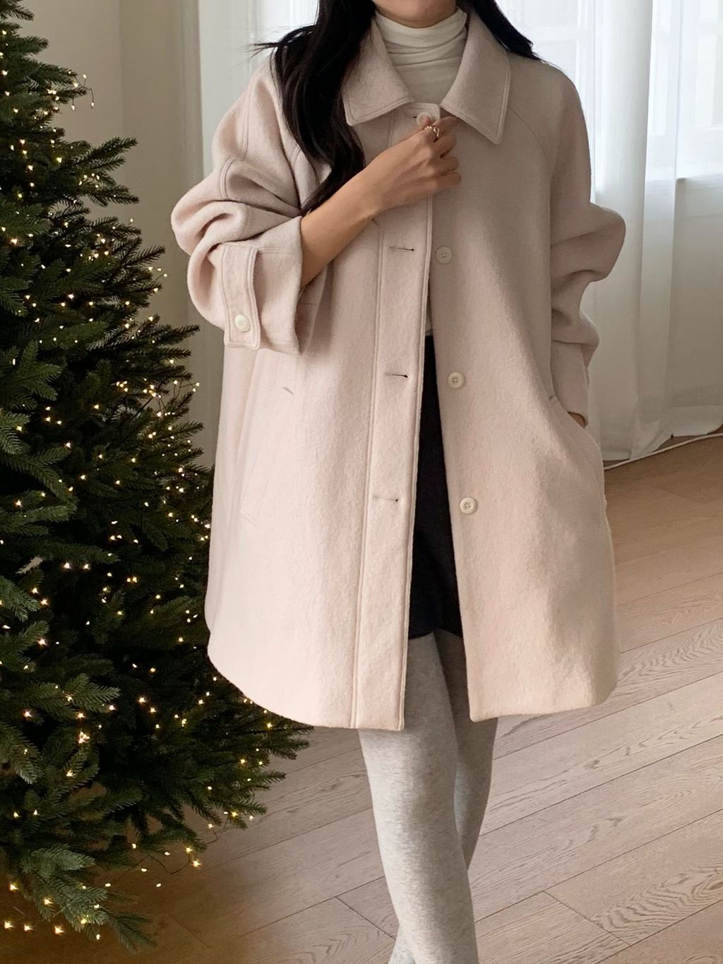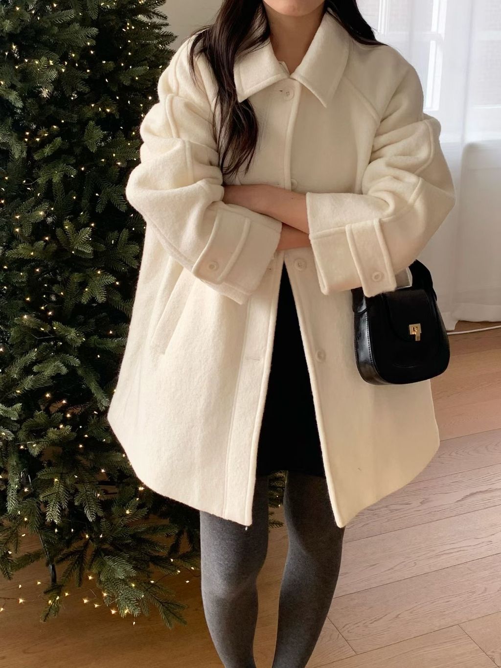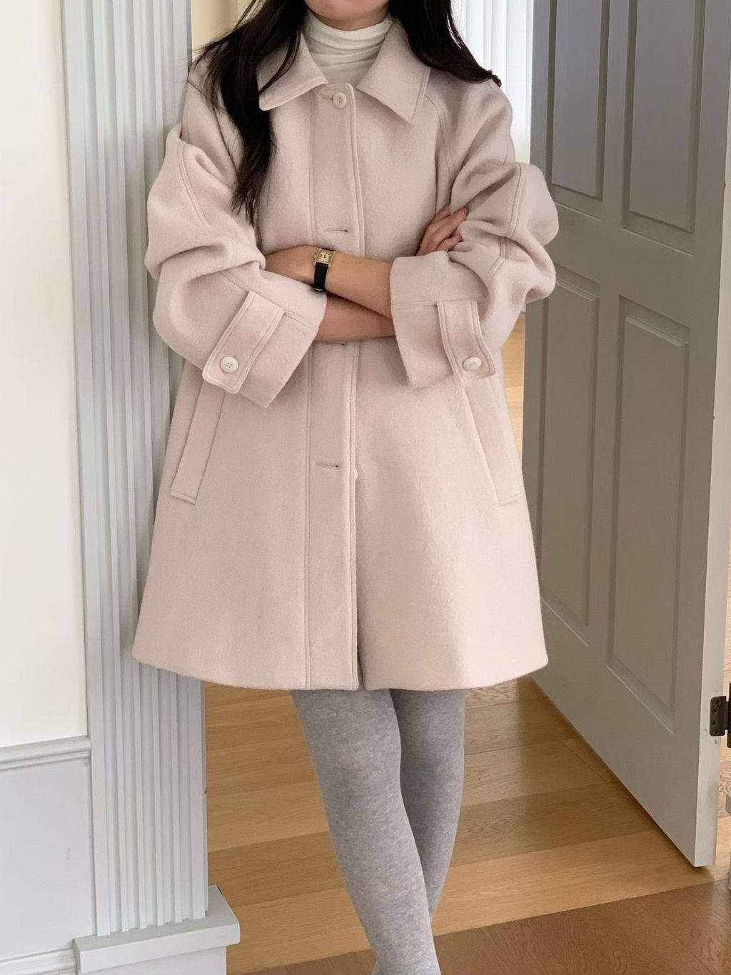 溫柔氣質翻領排釦羊毛長版外套 (Wool 80%)