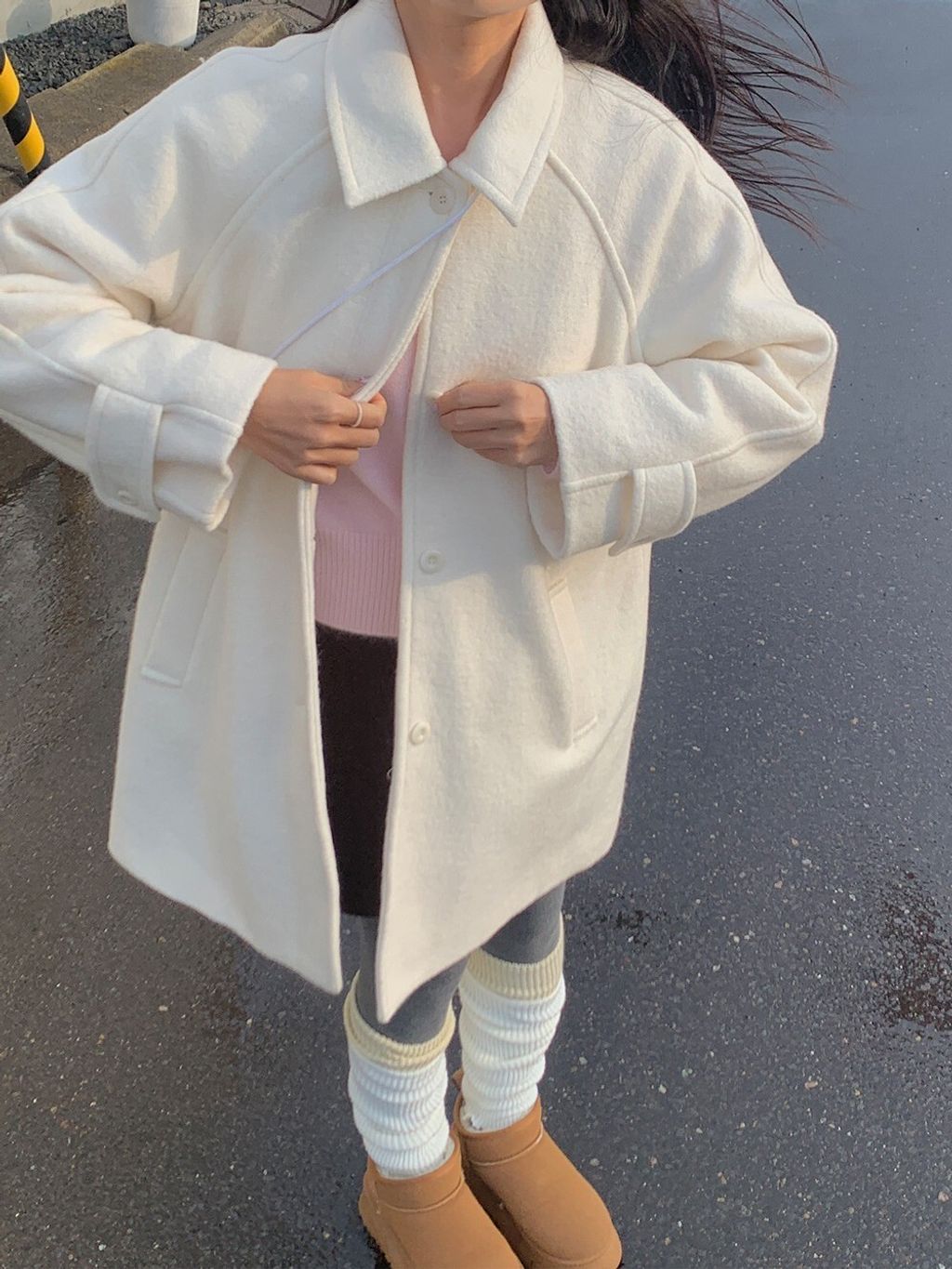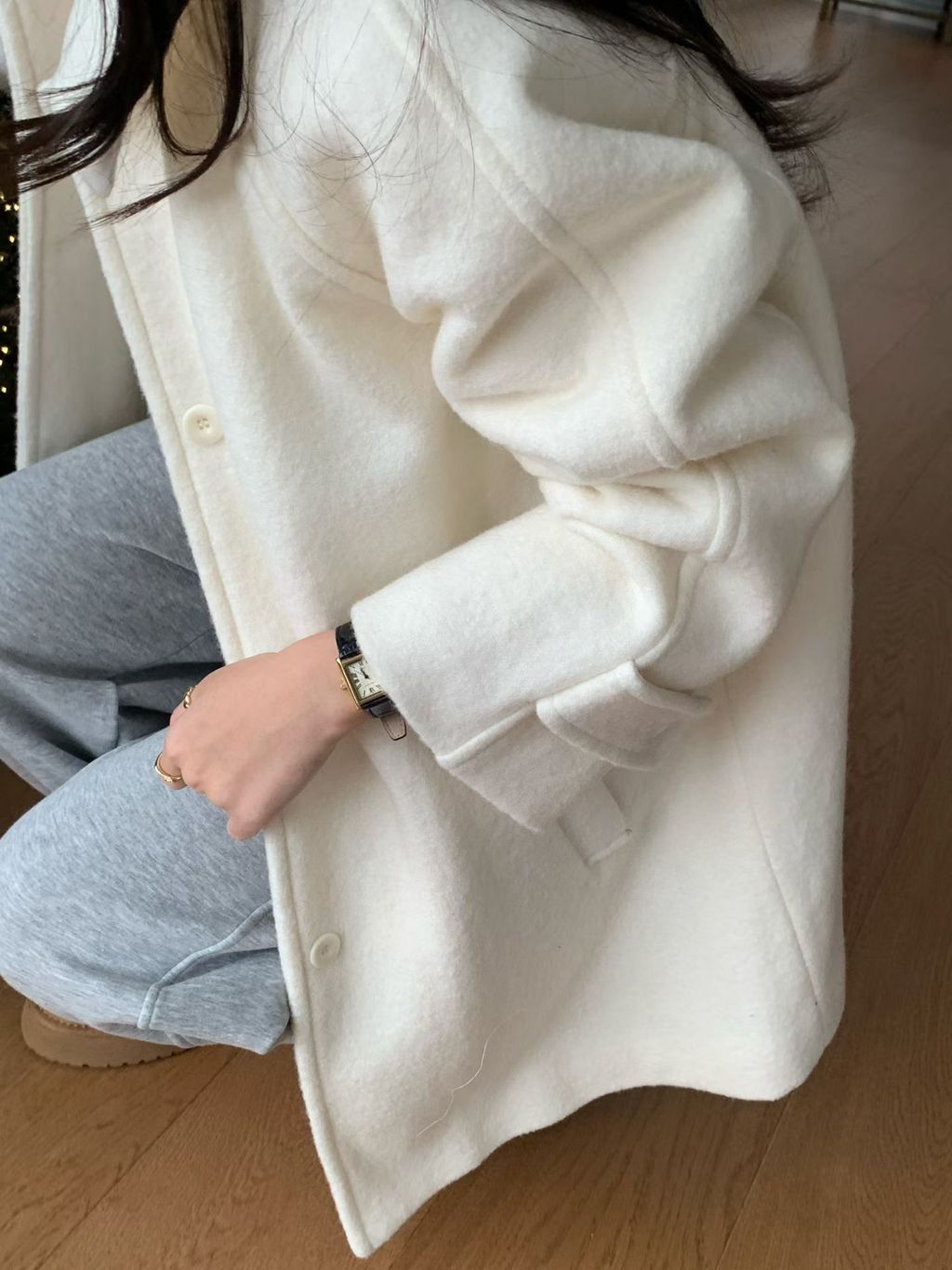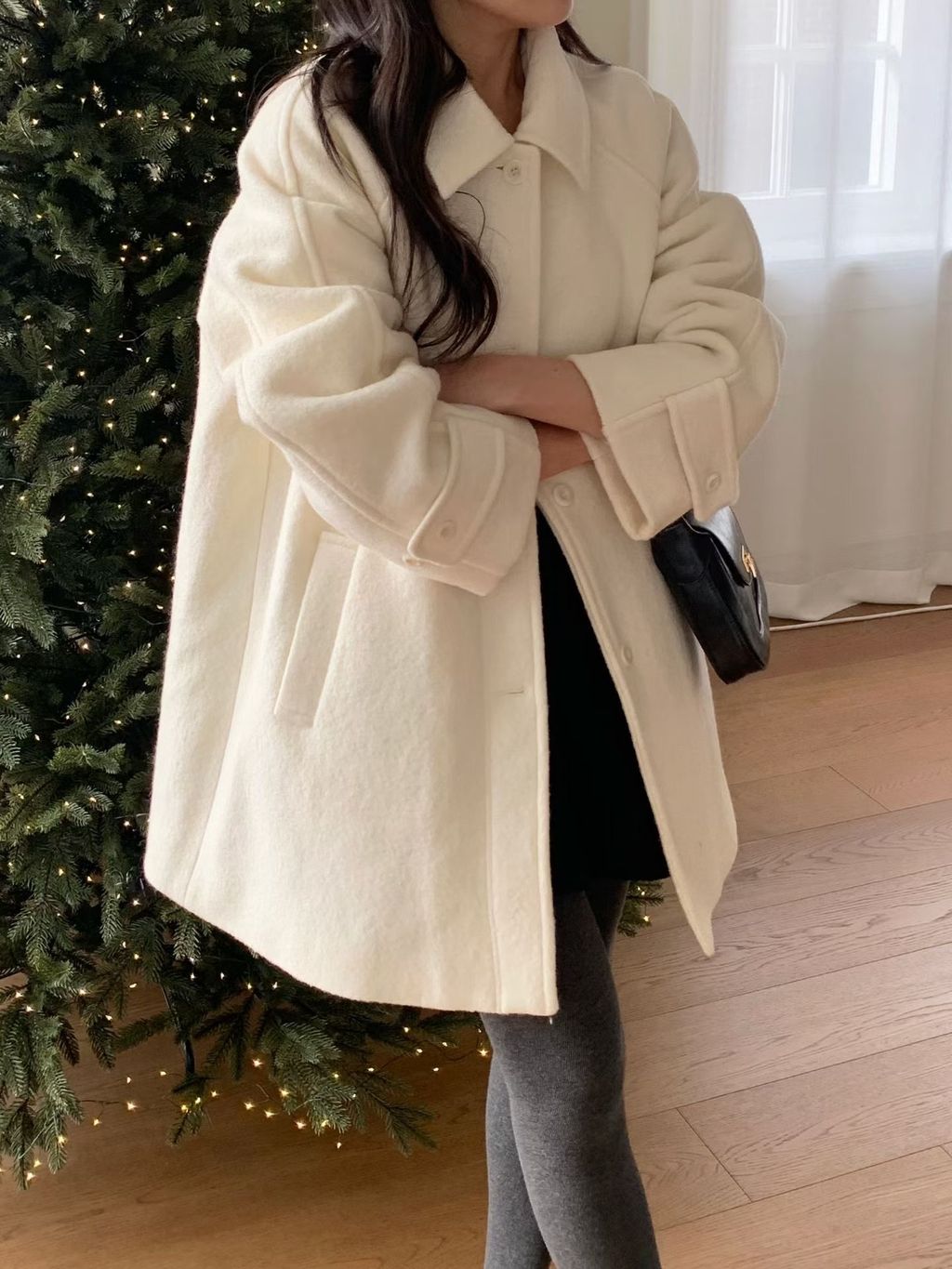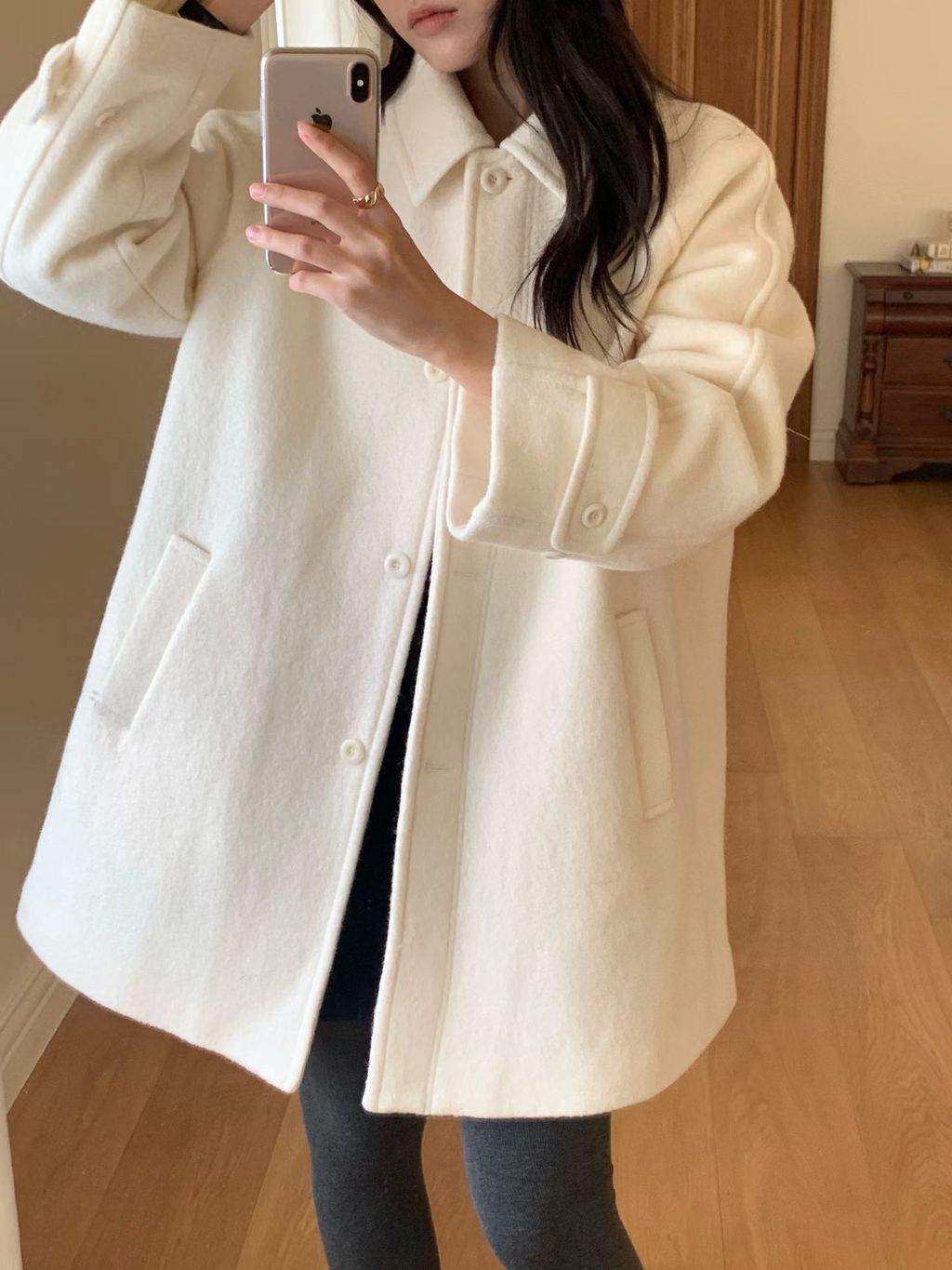 溫柔氣質翻領排釦羊毛長版外套 (Wool 80%)