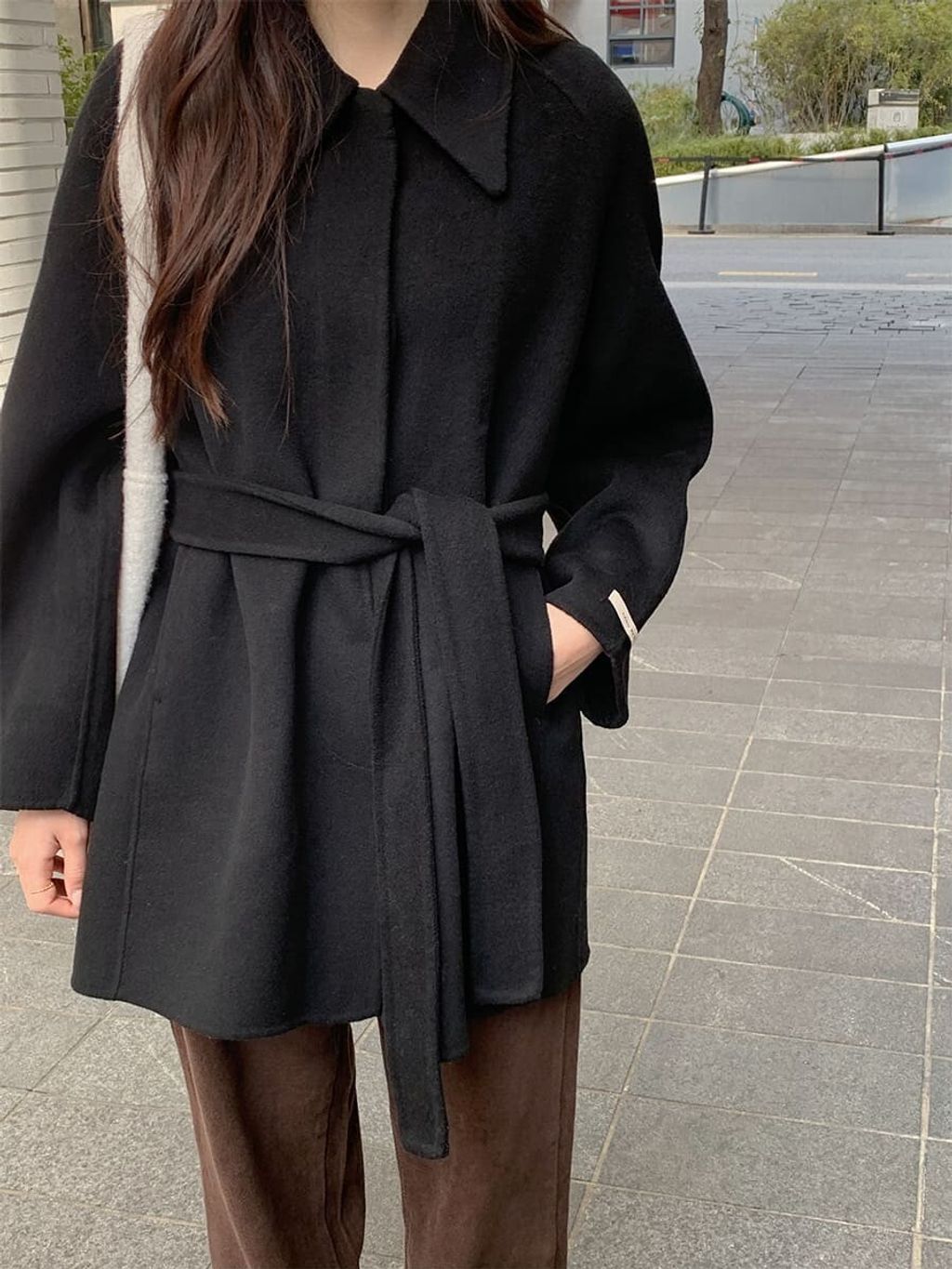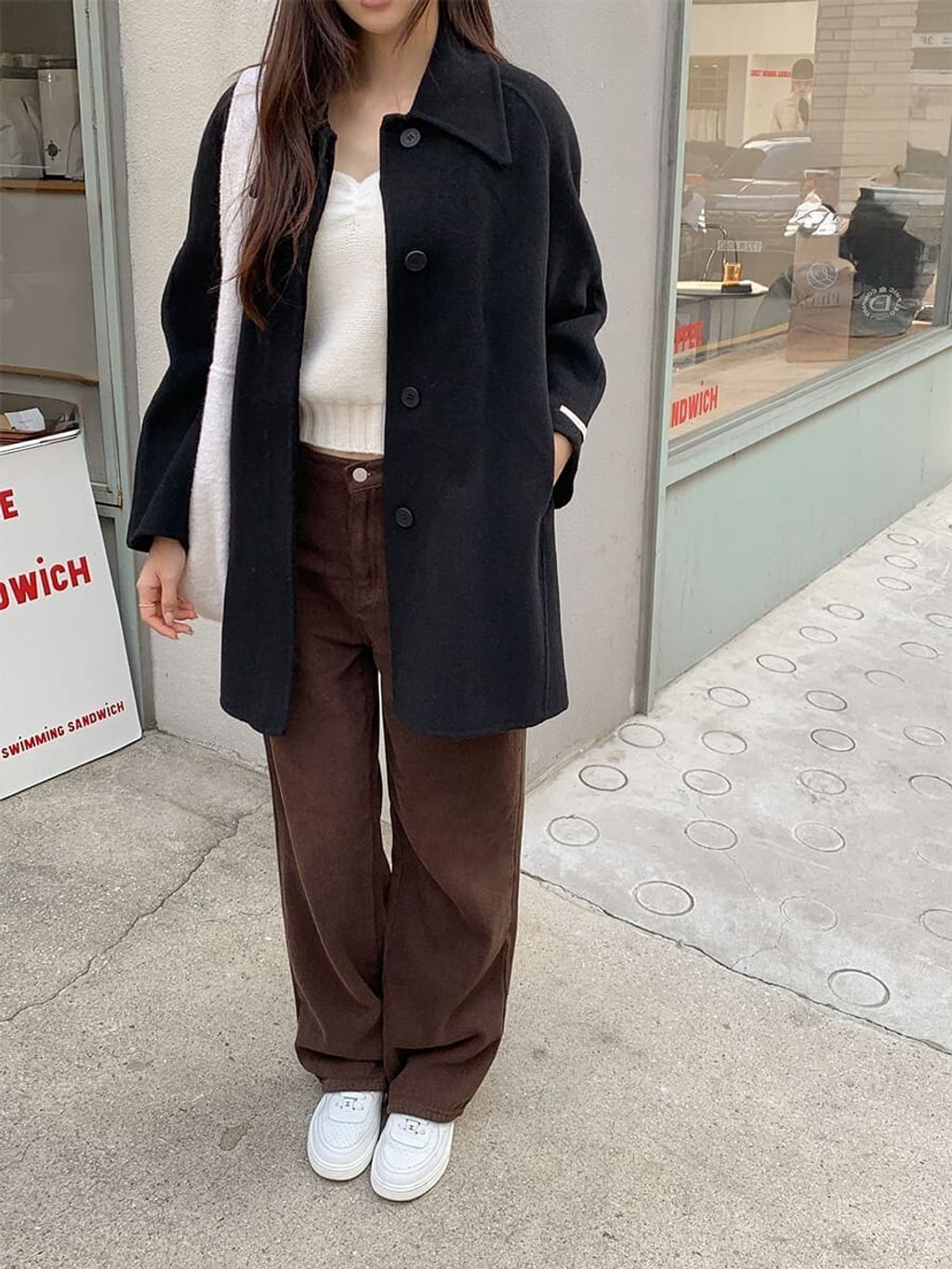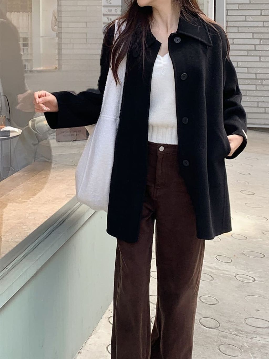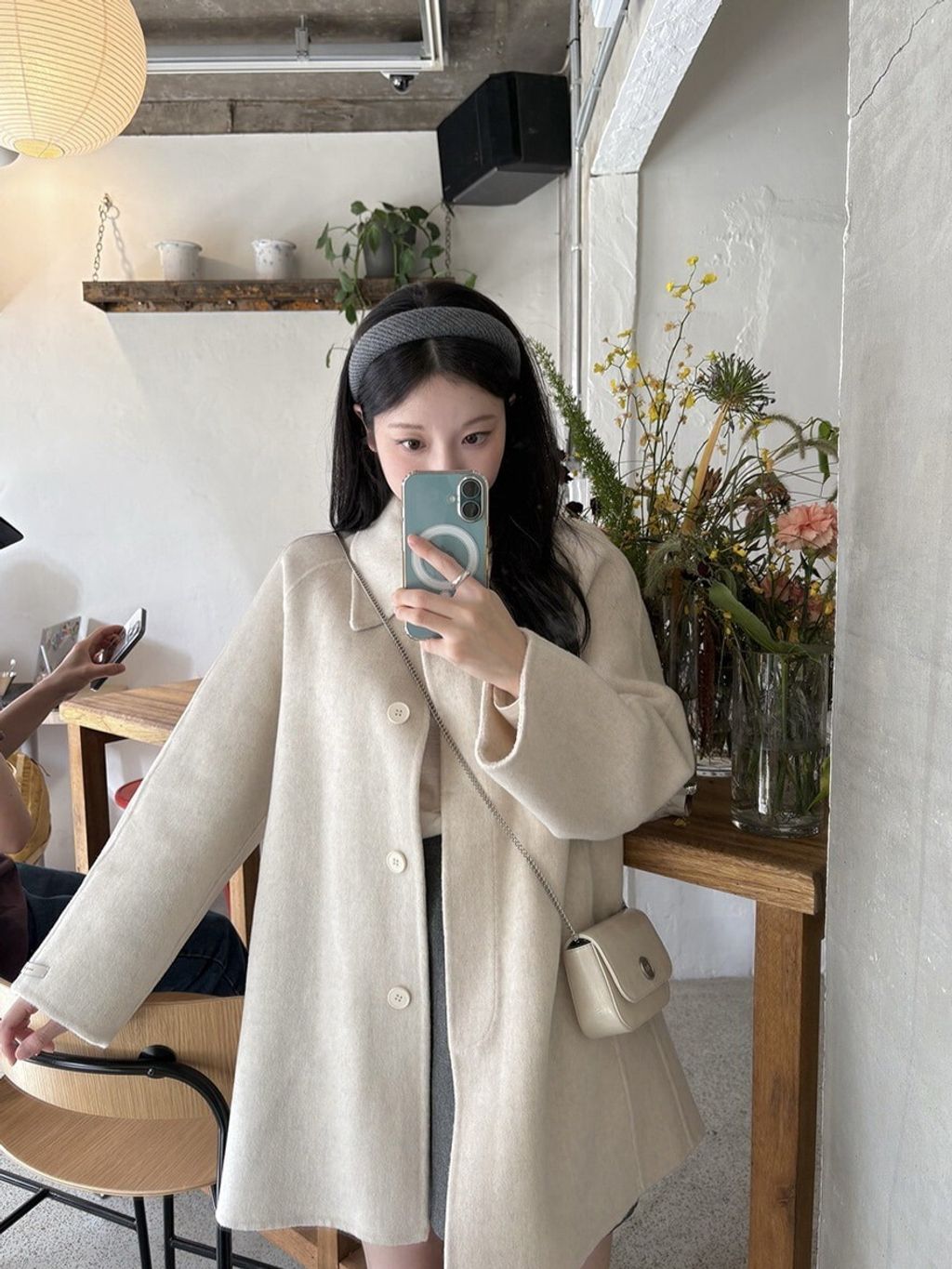 Handmade 氣質漂亮翻領排釦手工羊中長毛大衣 (Woo90%)